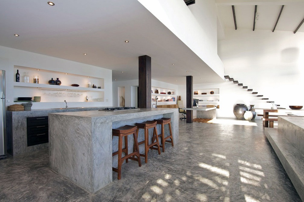 Trong quá trình thiết kế tủ bếp, một số người tin rằng việc đổ bê tông dưới khung tủ bếp sẽ giúp ngăn sàn ẩm mốc và tăng độ bền cho tủ. Ngoài ra, việc nấu nướng trên bề mặt tủ bếp khung bê tông mang lại cảm giác an toàn hơn. Tuy nhiên, mặt hạn chế của việc xây bếp bằng bê tông là không đạt được tính thẩm mỹ cao.