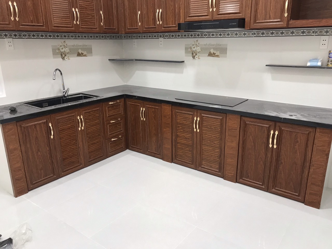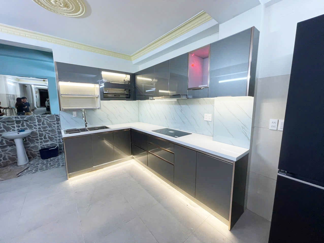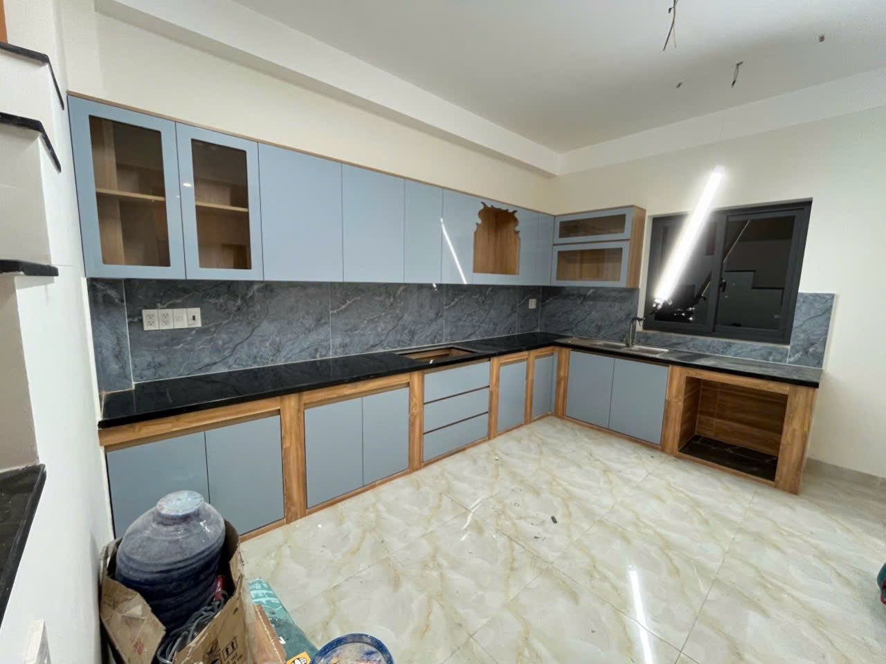 Sau khi khung tủ hoàn thiện, bề mặt sẽ được ốp gạch hoặc đá, đồng thời lắp đặt cánh tủ, phụ kiện và các thiết bị cần thiết. Công đoạn này giúp hoàn thiện tính thẩm mỹ và công năng của tủ bếp.