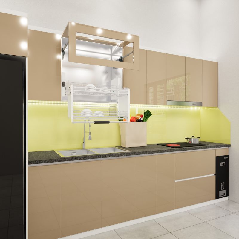 Tủ bếp chữ I bằng khung inox và cánh nhựa là sự lựa chọn hoàn hảo cho các gia đình có không gian bếp hạn chế về chiều rộng. Không chỉ sở hữu chất liệu inox kết hợp với nhựa Acrylic bền đẹp và chắc chắn. Tủ bếp này còn có thiết kế trang nhã và đẹp mắt, tạo điểm nhấn sang trọng cho không gian bếp.