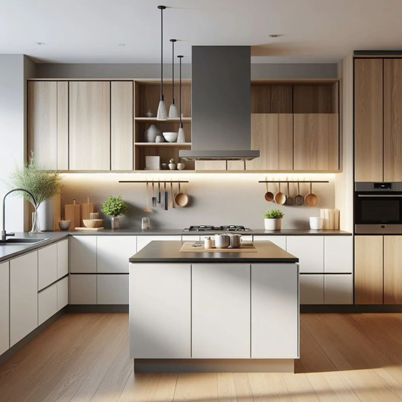 Mẫu tủ bếp này được thiết kế đơn giản nhưng tiện lợi với tủ trên dạng I và tủ dưới dạng L, giúp tối ưu hóa không gian mà không ảnh hưởng đến quá trình nấu nướng.