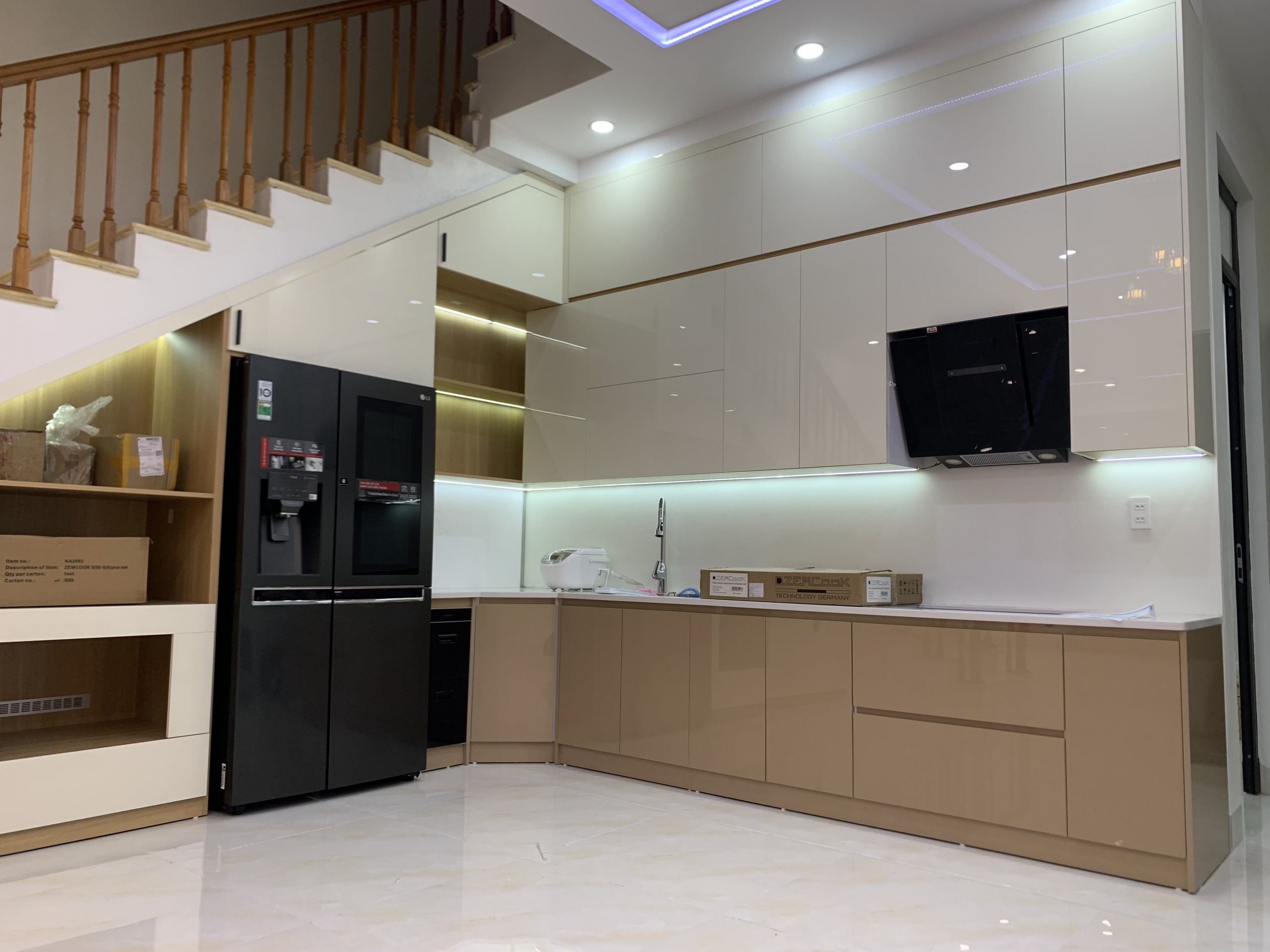 1.4. Tủ bếp inox cánh nhựa Acrylic bóng gương cao cấp hình chữ I