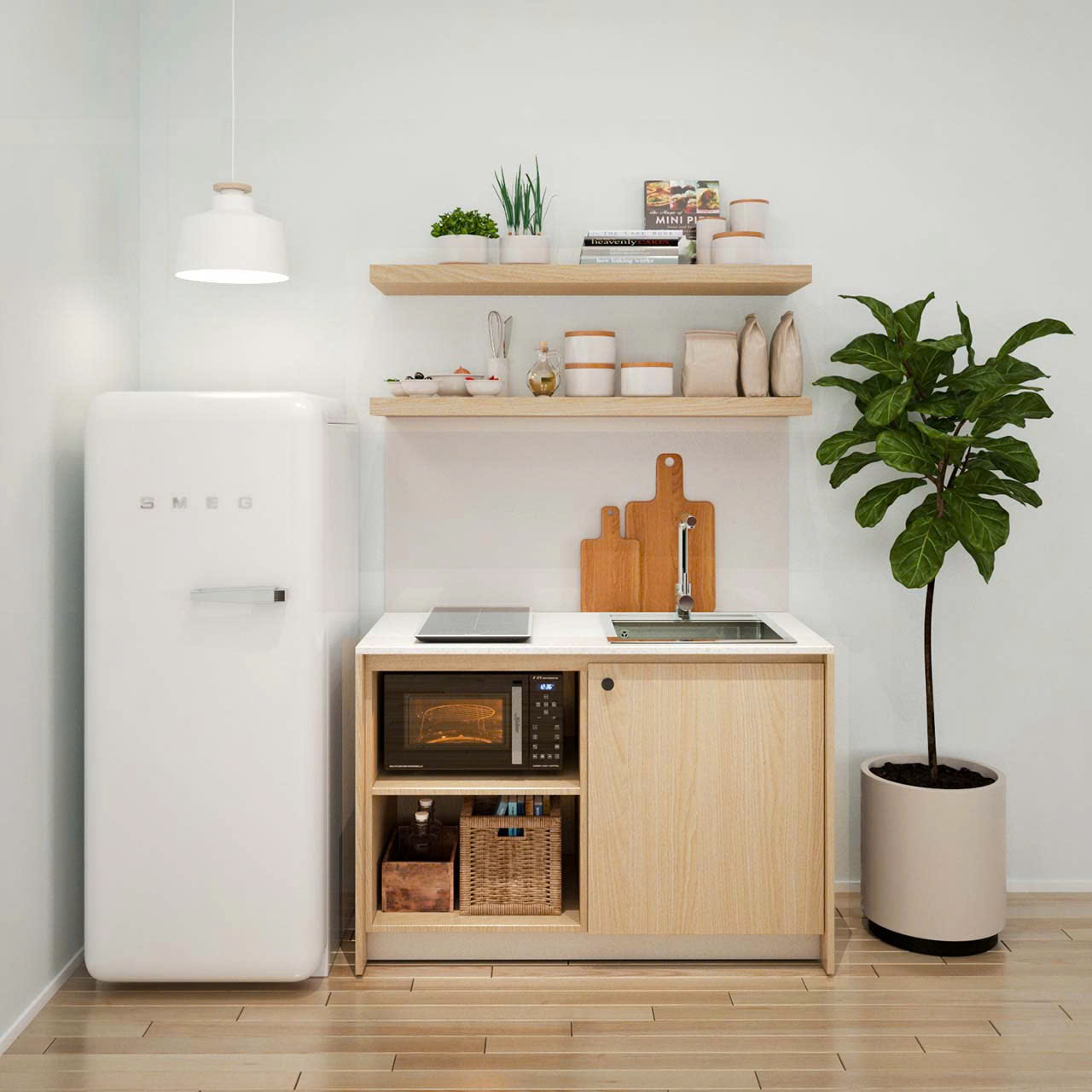 - Tiện nghi và công năng: Dù có kích thước nhỏ, tủ bếp mini vẫn đảm bảo đầy đủ tiện ích. Bạn vẫn có đủ không gian để lưu trữ chén bát, nồi niêu, gia vị và các dụng cụ bếp nhỏ khác. Ngoài ra, tủ bếp mini còn có thể được trang bị các tính năng như bếp từ, lò vi sóng. Hoặc tủ lạnh mini để phục vụ nhu cầu nấu nướng hàng ngày.