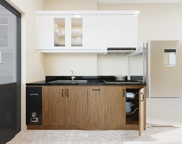 - Tiện nghi và công năng: Dù có kích thước nhỏ, tủ bếp mini vẫn đảm bảo đầy đủ tiện ích. Bạn vẫn có đủ không gian để lưu trữ chén bát, nồi niêu, gia vị và các dụng cụ bếp nhỏ khác. Ngoài ra, loại tủ bếp này còn có thể được trang bị các tính năng như bếp từ, lò vi sóng. Hoặc tủ lạnh mini để phục vụ nhu cầu nấu nướng hàng ngày.